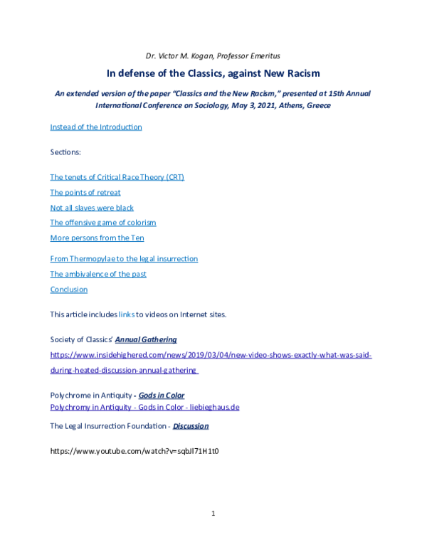Doc In Defense Of The Classics Against New Racism Victor M Kogan Academia Edu